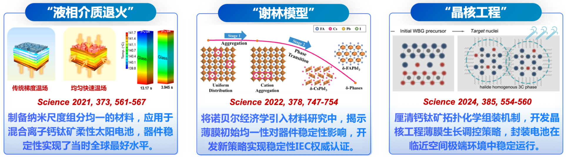• 开发“液相介质退火”的精准合成新方法,实现高质量、组分均一的钙钛矿薄膜的全天候可重复制备;