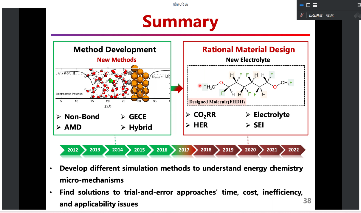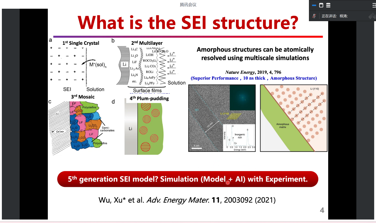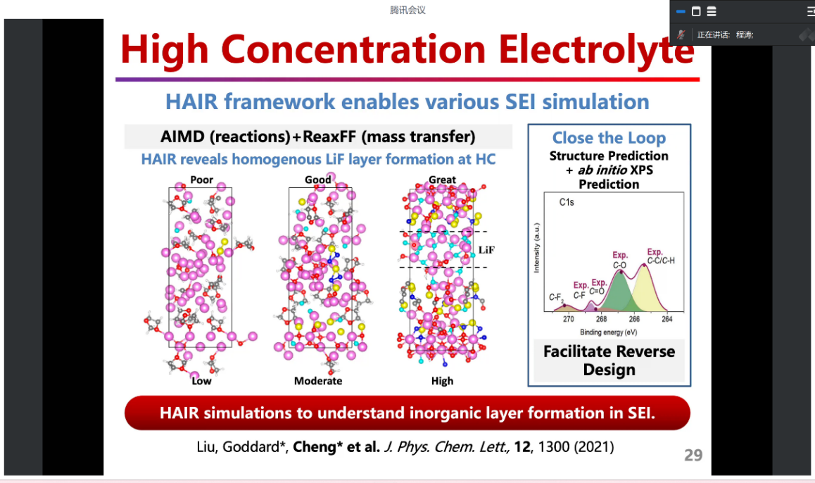 报告中,程涛教授首先介绍了多尺度模拟结合机器学习的重要性和主要面临的挑战。随后,又列举了前人通过不同方法的数据模拟对SEI形成过程和组成结构的解读。程涛教授团队的研究工作中引入了先进的多尺度模拟方法和多种混合算法,用于在工况条件下准确模拟电极/电解质界面和电化学反应。这些方法能够阐明在铜表面上进行二氧化碳还原的反应机制,并详细描述了锂/钠金属电池中SEI的纳米级原子结构。通过将机器学习(ML)与物理模型相结合,显著提高了表面光谱计算的效率和准确性,并提供了界面结构和反应的新见解。
