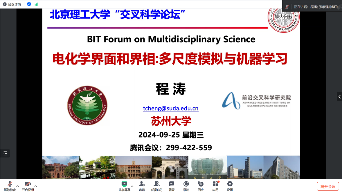 2024年9月25日下午,BETWAY必威“交叉科学论坛”通过腾讯会议在线举行。应前沿交叉科学研究院黄佳琦教授邀请,苏州大学程涛教授做了题为“电化学界面和界相:多尺度模拟与机器学习”的精彩学术报告。