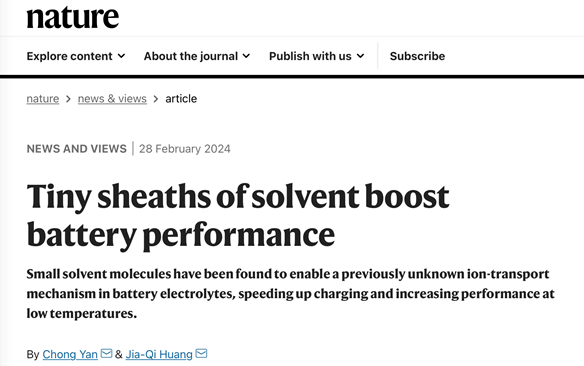 近日,《Nature》期刊邀请前沿交叉院闫崇副教授和黄佳琦教授在News&Views专栏发表《Tiny sheaths of solvent boost battery performance》(微型溶剂化结构提升电池性能)为题的评述,阐述新型溶剂化结构给锂电池快充和低温带来的新机会。 充电...