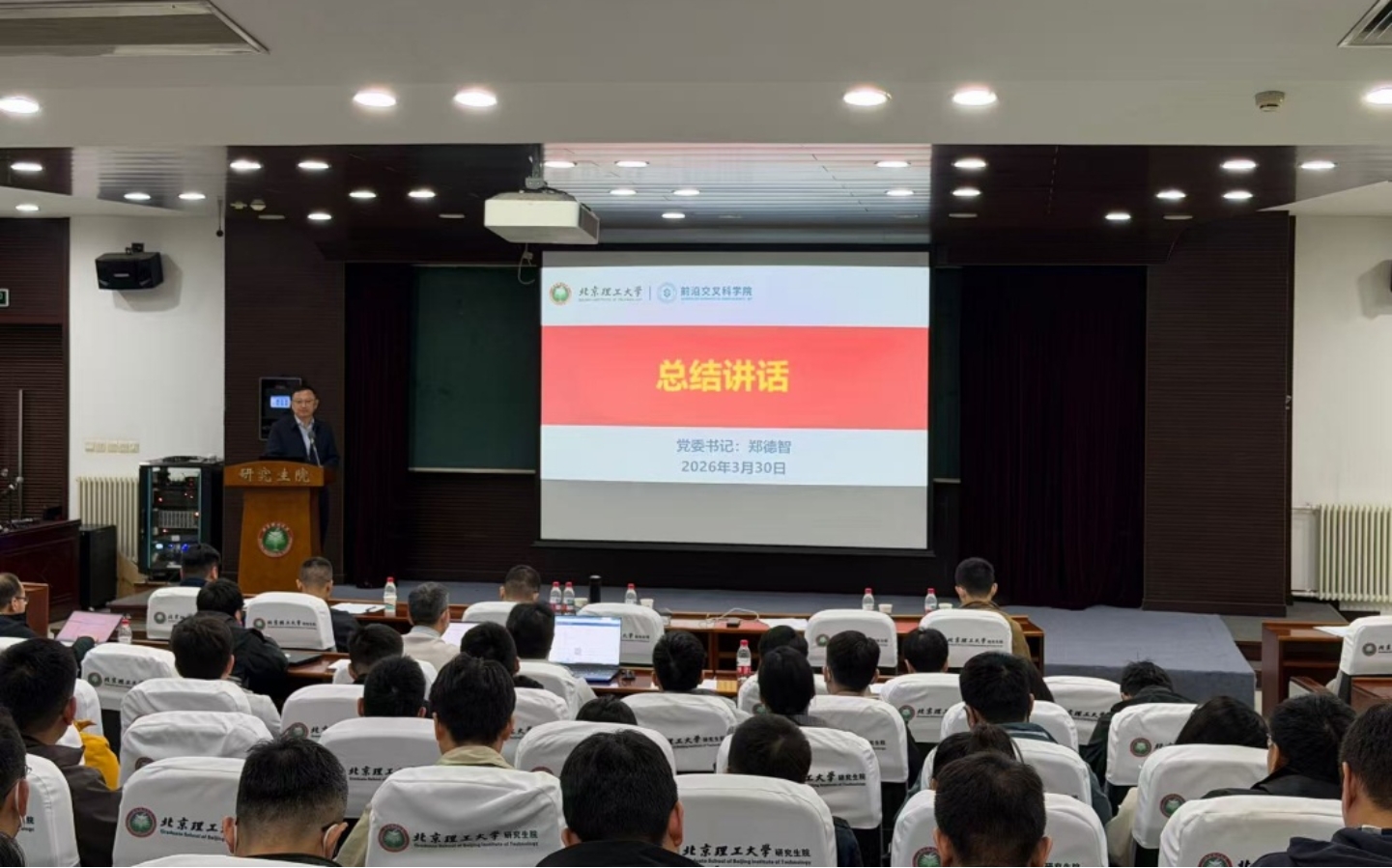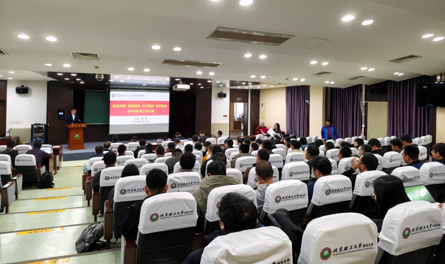 院长陈棋代表学院党委作了题为《前沿开拓 创新策源 交叉赋能 科学攀峰 2026年度工作汇报》的工作报告,报告系统阐述了学院“十五五”规划内容,重点围绕党建引领、师资队伍、基地平台、科技创新、教育教学等方面全面部署2026年工作,。