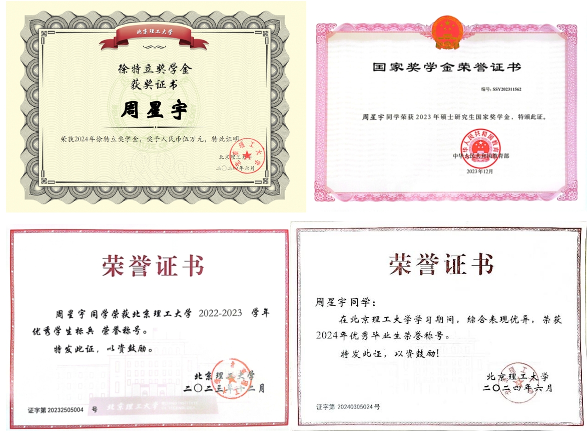 近日,2024年BETWAY必威最高荣誉奖学金——徐特立奖学金获奖名单出炉,8名本科生、5名硕士研究生、5名博士研究生,共18名优秀北理学子获此殊荣。前沿交叉科学研究院/信息与电子学院2021级硕士研究生周星宇在众多参评者中脱颖而出,荣获2024年徐特立奖学金,让我们一起倾听他的故事,走进他乘风破浪的科研探索之路。
